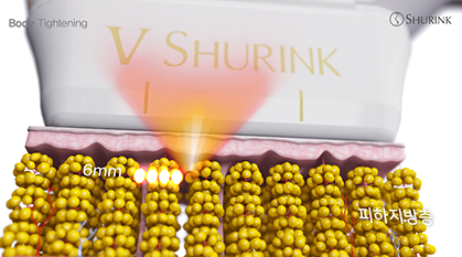 바디 슈링크는 6mm, 9mm의 카트리지로 하부진피층부터 피하지방층, 지방층의 섬유조직, 등의 심부피부층에 작은 열응고구역을 다수 유발시키는 방식으로 진행됩니다. 이는 피부의 재생과 회복을 유도하여 두꺼운 신체 부위의 탄력을 점진적으로 개선해줍니다.