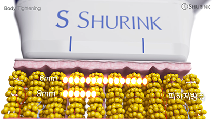 BODY ) 9mm 피하지방층에 열응고점을 형성하여 복부, 허벅지와 같은 바디 리프팅에 효과적입니다.